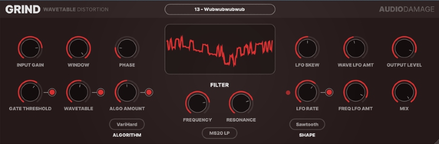 Grind, the real strength of Audio Wars, deals "damage" to audio damage. From subtle tube-style saturation to full-blown mangled wavetable distortion, Grind is a Swiss Army knife of sound design. Grind consists of three main blocks: wavetable lookup, algorithm saturation/distortion, and finally a multimode filter. The wavetable module uses the amplitude of the input signal to replace the samples with one of 15 linearly interpolated wavetables. Window size and phase controls offer further tone shaping possibilities.